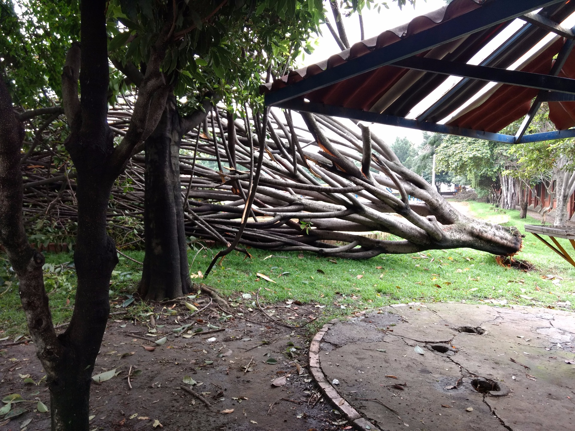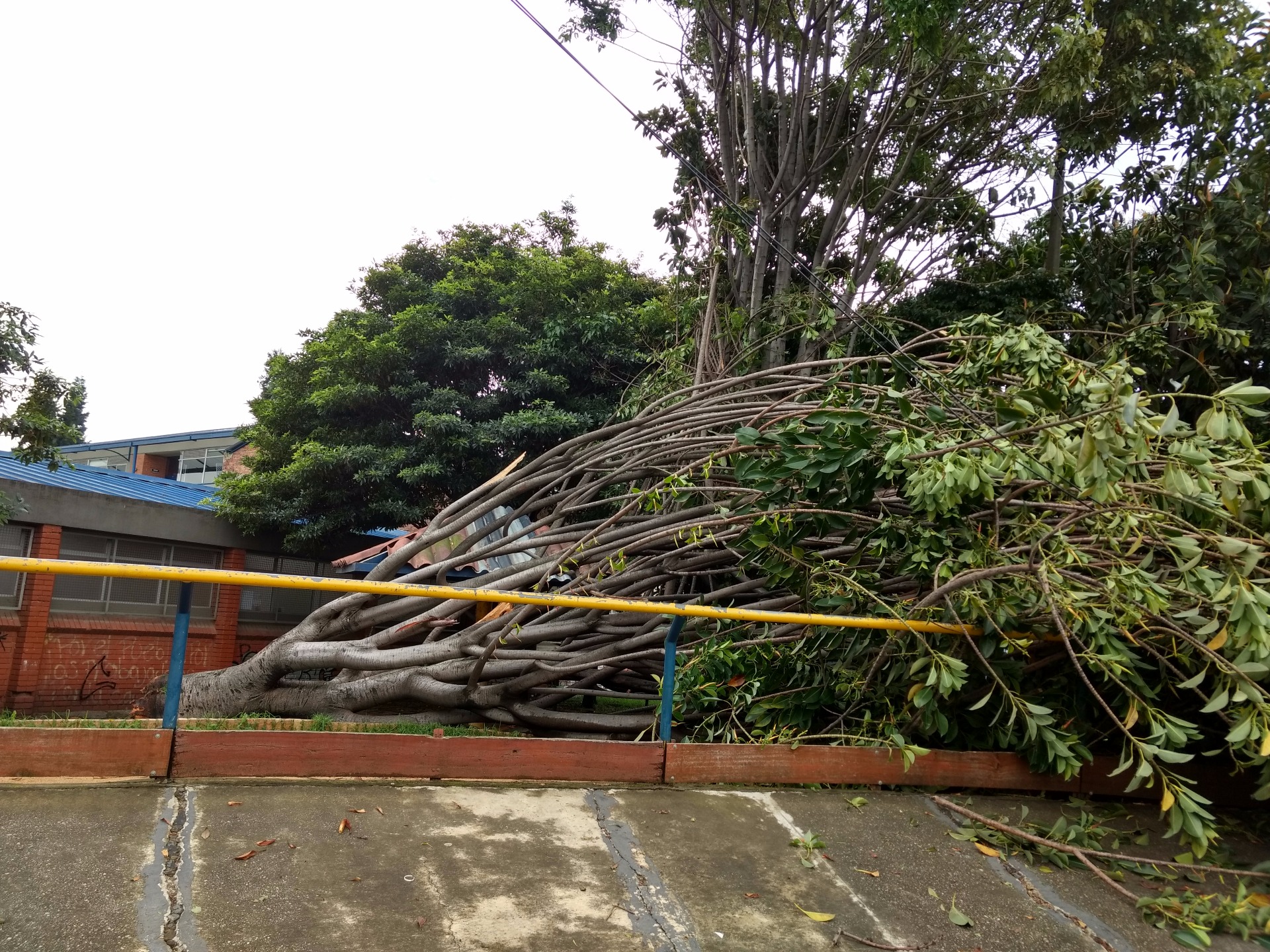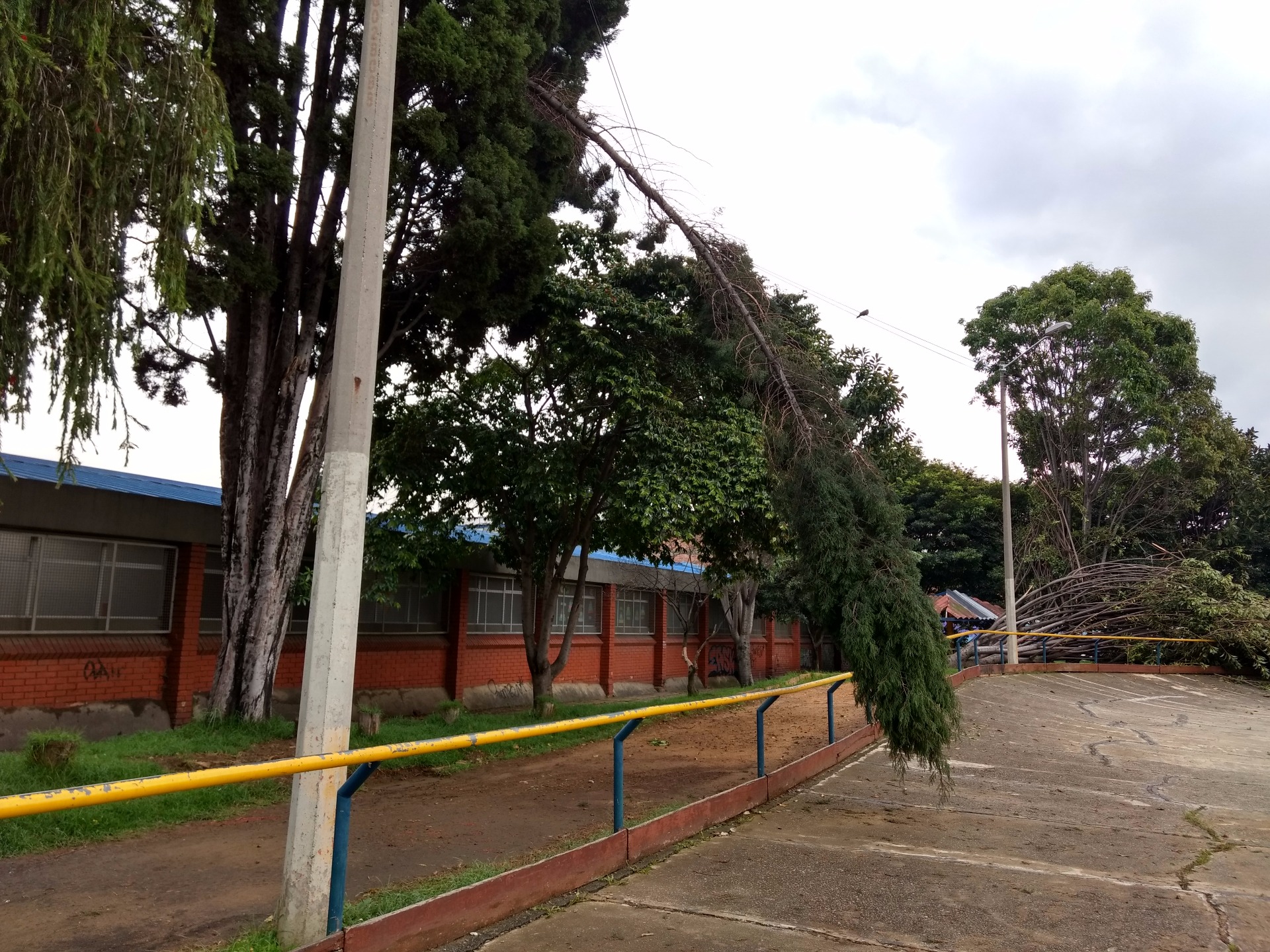 El día de ayer en horas de la tarde se desató un fuerte aguacero sobre la capital colombiana en donde varios barrios del distrito capital se vieron afectados de manera sensible por las lluvias continuas acompañadas de vientos fuertes. Muestra de ello es lo sucedido en el sector Quiroga Sur en donde dos de los árboles ubicados en el Polideportivo de la calle 40 sur se vinieron al piso, uno de ellos alcanzado por un rayo y el otro arrancado casi de raíz por el viento impetuoso, tal y como se puede apreciar en las gráficas. El riesgo es latente toda vez que al hacer la verificación se constata que la red eléctrica fue arrastrada por uno de los árboles convirtiéndose ello en riesgo para las personas que frecuentan el polideportivo, además de ello, los deportistas y usuarios se han visto imposibilitados de hacer sus prácticas atléticas pues el árbol quedó totalmente atravesado en la pista que se usa para tal fin. Un llamado a las autoridades correspondientes para que de manera pronta tomen las medidas necesarias que restauren la normalidad en este espacio recreodeportivo.